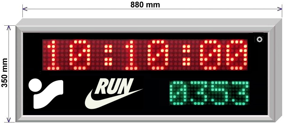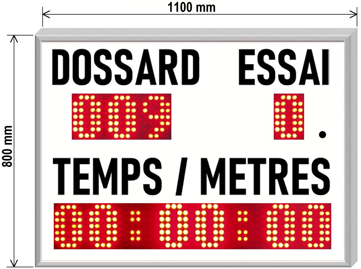 Coffret : Métallique étanche de couleur noire Fixation : murale par deux pattes à viser sur les cotés Dimensions : 1040 x 270 mm, épaisseur 70 mm, poids 8 Kg, Alimentation : Livré avec un câble secteur débrochable et un câble 12 volts continus débrochable Chiffres : Chiffres à 7 segments de 20 cm de hauteur Lecture : Jusqu’à 80 mètres maxi. LED : Mono-couleur (bleu) luminosité 1400 mCd, angle vision maximum 70° Luminosité : Forte pour l’extérieur Horloge : Heures : Minutes : Secondes (paramétrable en format 12H ou 24H) Chronométrage : Paramétrable en 99 Heures : 59 Minutes : 59 Secondes ou en 99 Minutes : 59 Secondes : 99 Centièmes Programmation : Par la télécommande infra-rouge livrée avec l’afficheur Commande : Start compteur/décompteur, Stop compteur /décompteur, RAZ. Fonctions pilotées manuellement par la télécommande Sauvegarde : De l’horloge interne, et des paramètres de programmation Début : De décomptage programmable par la télécommande Raccordement : Du bloc secteur indépendant sur une prise jack Clé USB : Comprenant la documentation technique (Française)