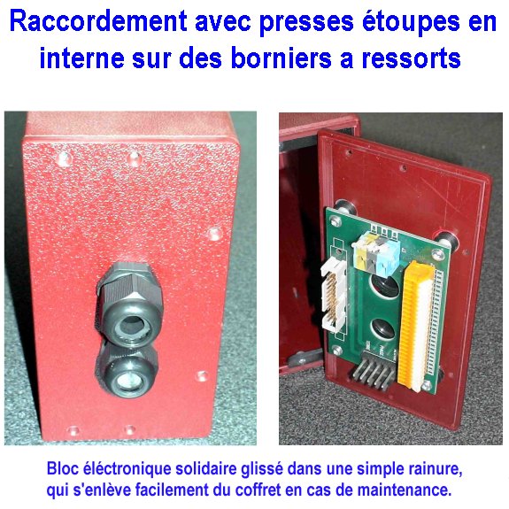 - Raccordement : interne avec presses étoupes sur des borniers à ressorts (de type WAGO)